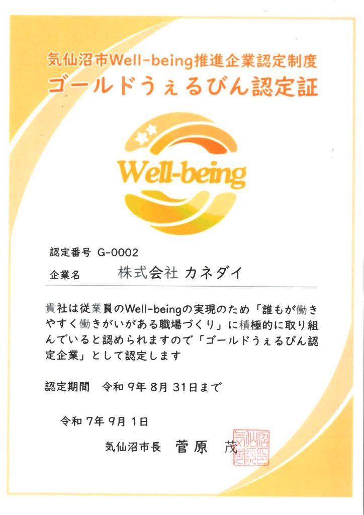 2025年9月1日 気仙沼市Well-being推進企業認定制度の「ゴールドうぇるびん」に認定されました!